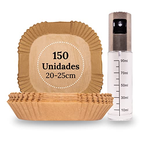 Papel freidora aire cosori 5,5-8 L, 150 piezas papel air fryer antiadherente con pulverizador aceite spray freidora aire de cristal de 100ml, papel para freidora de aire de 5-8L [20-25CM con spray]
