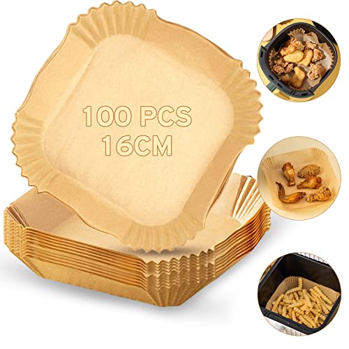 100 Hojas de Papel Pergamino para Freidora de Aire, Revestimiento de Papel Air Fryer Antiadherente, Bandejas Tazones de Papel para Hornear, Sartén, Horno, Freidora de Aire, 16 x 4,5 cm, Cuadrado