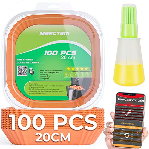 Marctani Papel para Freidora de Aire (100Piezas 20 CM) + Dispensador de Aceite, Accesorios Freidora Sin Aceite, Papel Air Fryer Cuadrado, Moldes Desechables, Papel Vegetal Antiadherente, Accessories